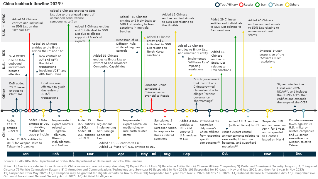 Chinese companies continued to be designated due to alleged support of sanctions and export‑control evasion involving Russia, Iran, and North Korea. Throughout 2025, more than 230 Chinese individuals and organizations were designated under OFAC’s Russia-, Iran-, and North Korea-related sanctions programs, alongside more than 15 additions to the Entity List for their alleged role in diverting controlled U.S.-origin goods to those regions. The U.S.-China Economic and Security Review Commission issued a report in November 2025, signaling the attention of U.S. regulators in this area.